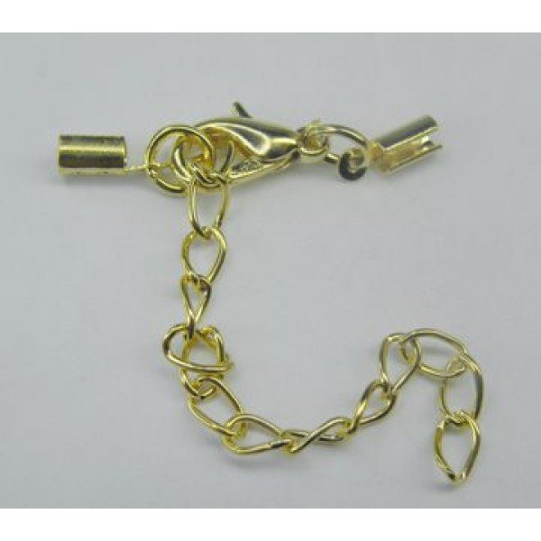 Cierre de mosquetón con cadena de extensión y terminales para cuerdas de 1,5mm en color oro